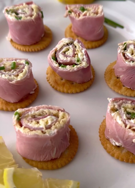 Smooth cream cheese rolled inside slices of ham, served on crispy mini crackers.